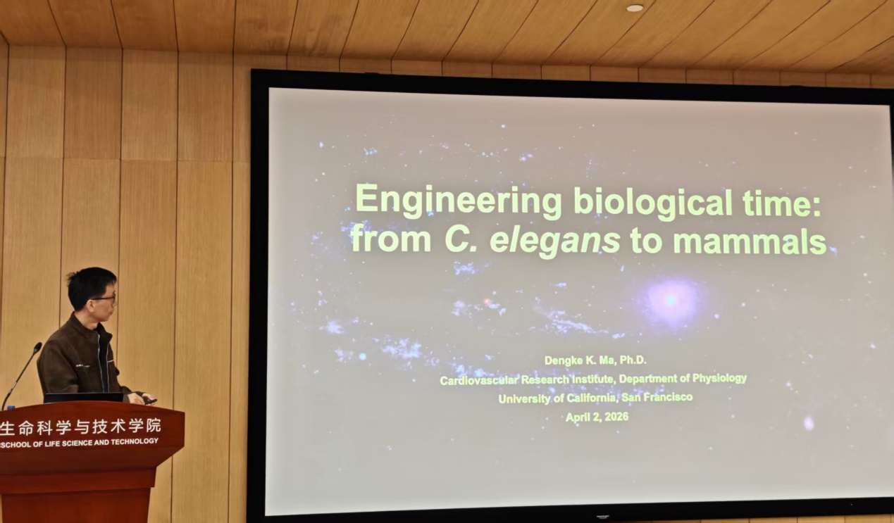 2026年4月2日,应上海科技大学生命科学与技术学院沈伟教授邀请,加利福尼亚大学旧金山分校马登科副教授做客生命学院,为师生带来一场题为“工程化生物时间:以滞育态为模型解码生命系统中的能量-时间调控”(Engineering biological time:from C. elegans to mammals)的精彩学术报告。马教授长期致力于研究生物如何应对环境压力。他的团队利用线虫、甚至能极寒冬眠的北极地松鼠细胞等模型,探索基因和分子如何帮助细胞和生物体抵抗压力、维持稳定,并适应温度与氧气变化。